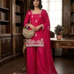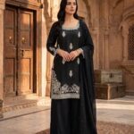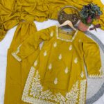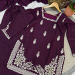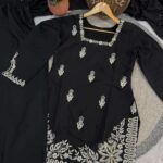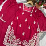 The designer kurti features intricate 3mm sequins embroidery work, adding a subtle shimmer and refined detailing to the overall look. It is paired with a comfortable Roman silk palazzo, designed with an elastic waistband for a perfect and flexible fit.