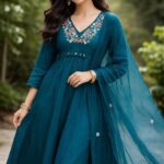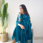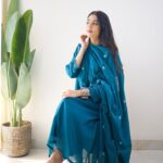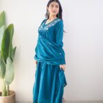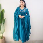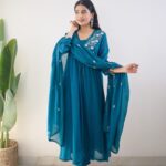 The outfit features a graceful Anarkali-style kurti adorned with heavy embroidery work on the yoke, adding a rich and sophisticated touch. The matching pant ensures a sleek fit, while the lightweight dupatta with delicate embroidery enhances the overall festive charm.