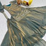 The stylish kurti-style choli is paired with a grand 5-meter flair lehenga, enhanced with attached canvas and cancan for a voluminous and graceful look. The outfit is completed with a matching embroidered dupatta, adding a perfect finishing touch.