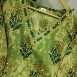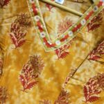 The kurti features a stylish V-neck design with elegant handcrafted detailing on the yoke, paired with a matching cotton pant for a relaxed yet graceful fit. The highlight of this set is the stunning Azrak Bagru printed dupatta, adding a vibrant and artistic touch to the overall ensemble.